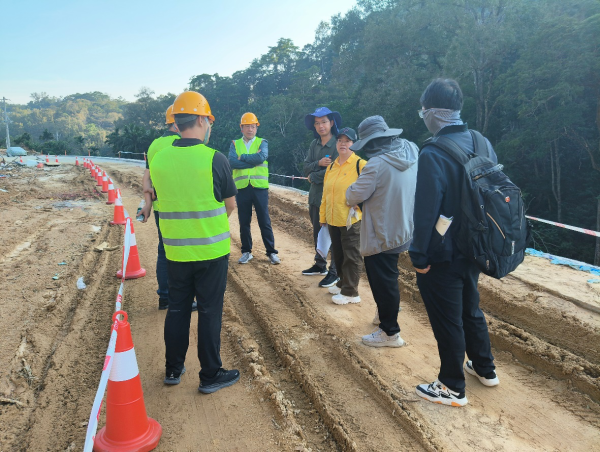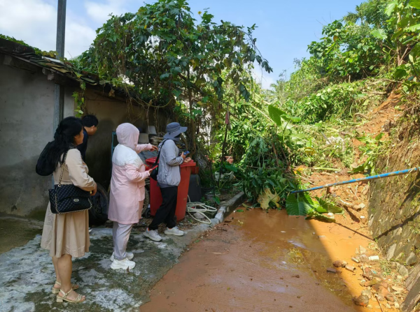 灾情就是命令,海口中心带好调查装备,驾车冒着狂风暴雨紧急驰援琼中。在极端强降雨冲击下,琼中县道、省道公路及在建公路道路两侧边坡及高切边坡等多处发生小型滑坡及塌方。奔赴灾情事发地途中,一路险情不断,山体滑坡造成堵路、道路积水塌陷不能通行情况时有发生。调查组最终在当地村民的指引和琼中县地质灾害主管部门工作人员的电话指导下到达现场,与地方地灾技术支撑专家会合,及时了解沟通灾情险情信息,对险情初步会商后旋即到达现场,紧锣密鼓地开展相关调查工作。