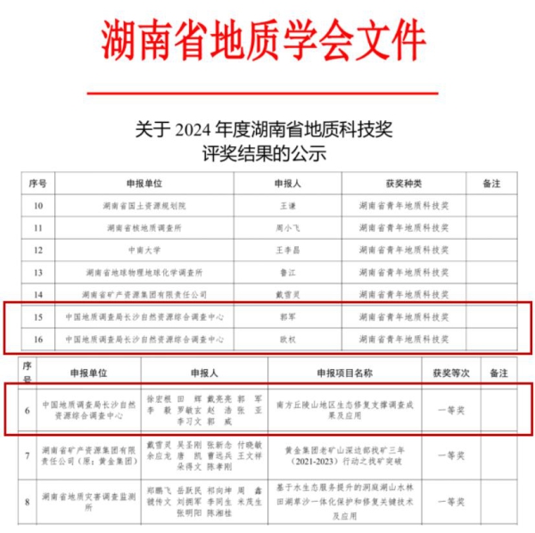 近日,湖南省地质学会公布了“2024年度湖南省地质科技奖评奖结果”,中国地质调查局长沙自然资源综合调查中心(简称“长沙中心”)申报的“南方丘陵山地区生态修复支撑调查成果及应用”获湖南省地质科技进步奖一等奖,郭军和欧权2名同志荣获湖南省青年地质科技奖。