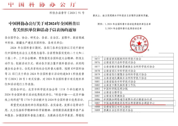 近日,中国科协办公厅印发《中国科协办公厅关于对2024年全国科普日有关组织单位和活动予以表扬的通知》,中国地质调查局昆明自然资源综合调查中心(以下简称“昆明中心”)被评为“2024年全国科普日活动优秀组织单位”。
