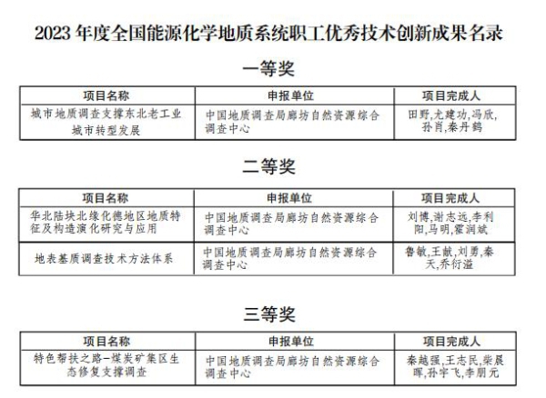 近日,中国能源化学地质工会全国委员会发布《关于全国能源化学地质系统优秀职工技术创新成果评审结果的通报》,中国地质调查局廊坊自然资源综合调查中心(以下简称“廊坊中心”)四项成果喜获2023年度优秀职工技术创新成果奖。其中,“城市地质调查支撑东北老工业城市转型发展”荣获一等奖;“华北陆块北缘化德地区地质特征及构造演化研究与应用”和“地表基质调查技术方法体系”荣获二等奖;“特色帮扶之路-煤炭矿集区生态修复支撑调查”荣获三等奖,中心获奖等级和数量均创历史新高。