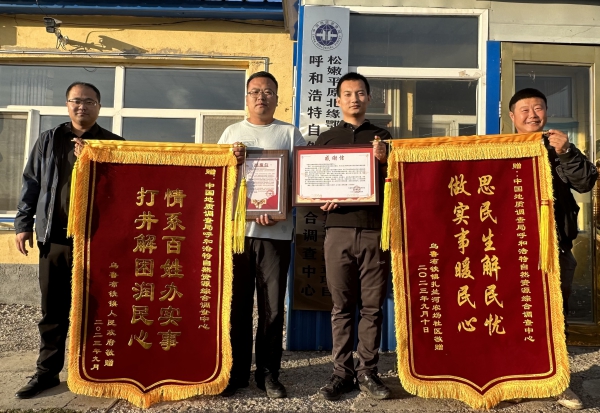 近日,内蒙古自治区呼伦贝尔市鄂伦春自治旗乌鲁布铁镇政府为中国地质调查局呼和浩特自然资源综合调查中心送上锦旗和感谢信,对该中心在当地开展的黑土地地表基质调查工作给予了充分的肯定,并对他们在解决当地用水困难、协助政府支撑服务乡村振兴工作表示感谢。