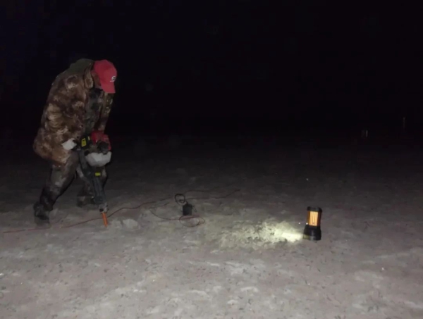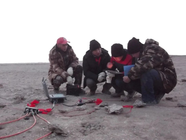 该项目工作区地处戈壁腹地,自然条件恶劣。作业期间,环境温度低至零下10摄氏度,8级强风沙,地表盐壳厚度达20-40厘米,极大增加了作业难度。为减弱高盐度地层的电磁干扰,项目组采用电极预埋盐浆处理工艺,有效改善其接地条件。针对硬质地层布点难题,项目组改进了油镐冲击频率与钻头角度,提高布点效率与精度,确保采集数据精准可靠 。