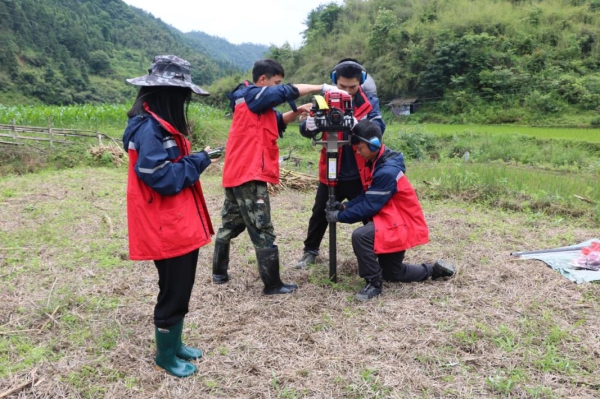 图片说明:长沙中心平江项目组调查人员在湖南省岳阳市平江县开展1:5万土地质量深层土壤样品采集工作。