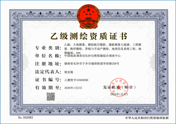 近日,中国地质调查局长沙自然资源综合调查中心(简称“长沙中心”)顺利通过测绘资质扩项审批,获海洋测绘乙级资质证书。目前,该中心已具备八项乙级测绘资质,具备开展多项测绘业务的资格与能力。