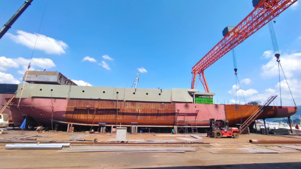 2021年11月,船舶大队的高级船员招聘计划正式启动,船舶大队开始了新一轮的人员补充与队伍建设。现“海洋地质二十六号”调查船船长司蒙,就是在这一轮队伍建设中加入船舶大队的。到此之后,他的第一个任务就是亲赴福建省恒生船舶重工有限公司造船厂,带领人员参与到调查船的监造工作中。有过十几年船长任职经验的他,曾指挥过8000吨客滚轮穿梭于南海,甚至参与过“瓦良格”号的拖运工作,大船接新、舾装、拆解维修对他而言已是寻常事。饶是如此,当他在造船厂亲眼见证未来将由自己指挥的调查船从一块块钢板逐渐成形为千吨重舰,也不免感到新奇。
