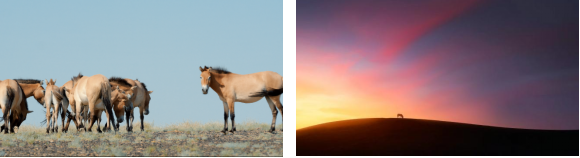 行驶在卡拉麦里南部戈壁,可以看到一群似马非马、似驴非驴的有蹄类动物,它们三五成群,或觅食或奔跑。普氏野马有6000万年进化史,比大熊猫的历史还悠久,是国家一级重点保护野生动物,是世界上原有300多种野马中唯一幸存下来的物种,被称为“荒漠活化石”。
