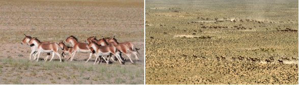 在卡拉麦里经常可以看到与普氏野马体型相似的有蹄类动物,比起野马它们头小、耳朵长,好动擅跑,无“踏青腿”,这就是与普氏野马亲缘关系很近的另一种马科动物——蒙古野驴。蒙古野驴是国家一级重点保护野生动物,分布区东起蒙古二连浩特沿中蒙边界狭长地域至新疆北部盆地。卡拉麦里现有全国80%以上的蒙古野驴,数量近4000匹。