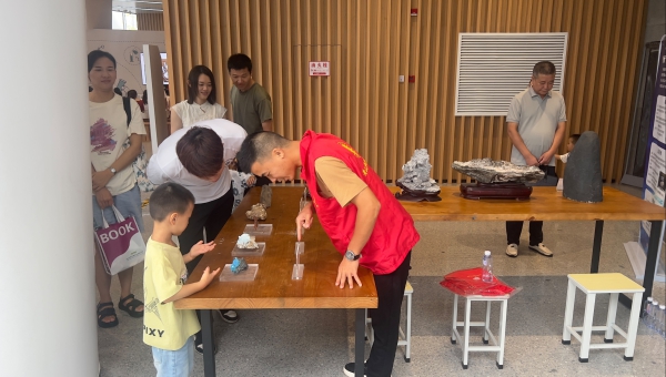 活动中,各式各样的岩石标本错落有致地陈列,科普工作者详细介绍了三大岩石的形成、分类以及地质构造等基础地质知识,重点讲解灰绿色的孔雀石、条纹状磁铁矿、细腻温润的紫水晶形成地域、特征、功效、富含元素,吸引了黄山市百余名中小学生和市民围观,整个活动现场洋溢着温馨、愉快的氛围,参观者们通过亲手触摸岩石的直观体验,感受地质科学的深邃和奇妙,在欣赏矿石之美的同时,对地球奥秘有了更直观和深入的理解。科普志愿者还展示了黄山观测站丰富的多彩矿石和观测成果,让参观者们对黄山观测站有了进一步深入了解。