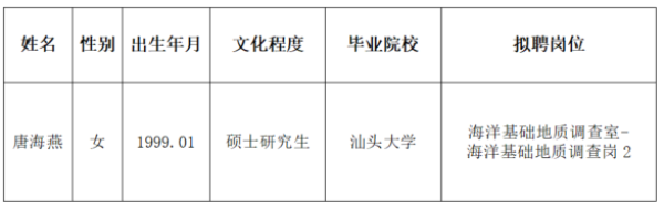 根据《中国地质调查局局属单位2025年度公开招聘工作人员公告(第一批)》有关要求,因海洋基础地质调查室海洋基础地质调查岗2综合成绩排名第一考生罗成自愿放弃应聘资格,经研究,现按规定递补该岗位综合成绩排名第二的考生唐海燕进入考察人员名单。