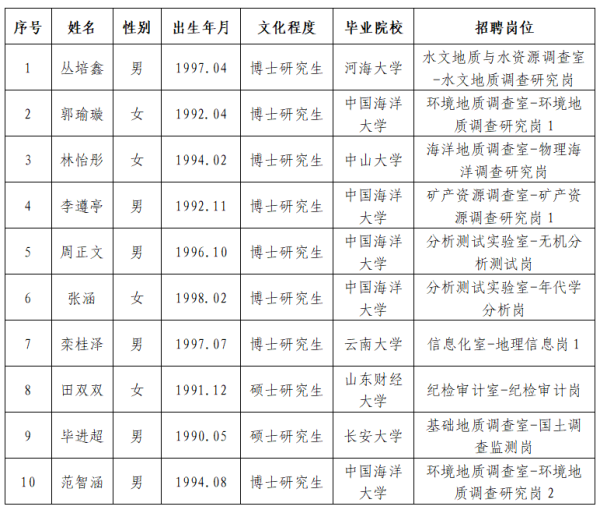 (注:海洋地质调查室-海域重磁调查研究岗无人参加面试,取消本次岗位招聘;环境地质调查室-环境地质调查研究岗2计划招聘2人,仅1人面试成绩达到80分,取消该岗位另一人次招聘。)