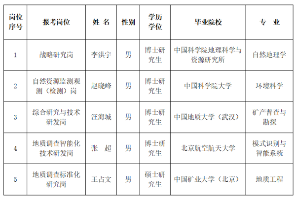 根据《中国地质调查局自然资源综合调查指挥中心2025年度公开招聘社会在职人员公告》,经资格审查、面试等程序,按照面试成绩由高到低的排序,确定考察对象5名,现将名单公告如下:
